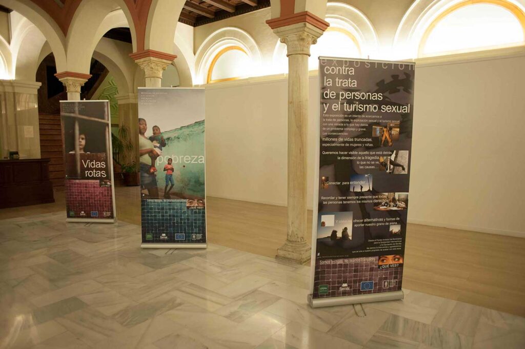La muestra se exhibe paralelamente en las Diputaciones de Huelva, Jaén y Sevilla. En la Diputación de Huelva, se inauguró el 3 de marzo la exposición de Lucha contra la Trata, una muestra que supone un punto y seguido. Es una de las últimas actividades de un proyecto que ha durado tres años y es el comienzo de un recorrido que pasará por los municipios de las provincias de Huelva, Sevilla y Jaén, mostrando a la ciudadanía las causas de una actividad delictiva que mueve millones de euros al año, afecta a 12 millones de personas en el mundo y se desarrolla en 160 países. Una exposición para concienciar contra la trata de personas y el turismo sexual.rnrnLa exposición en la Diputación de Huelva: